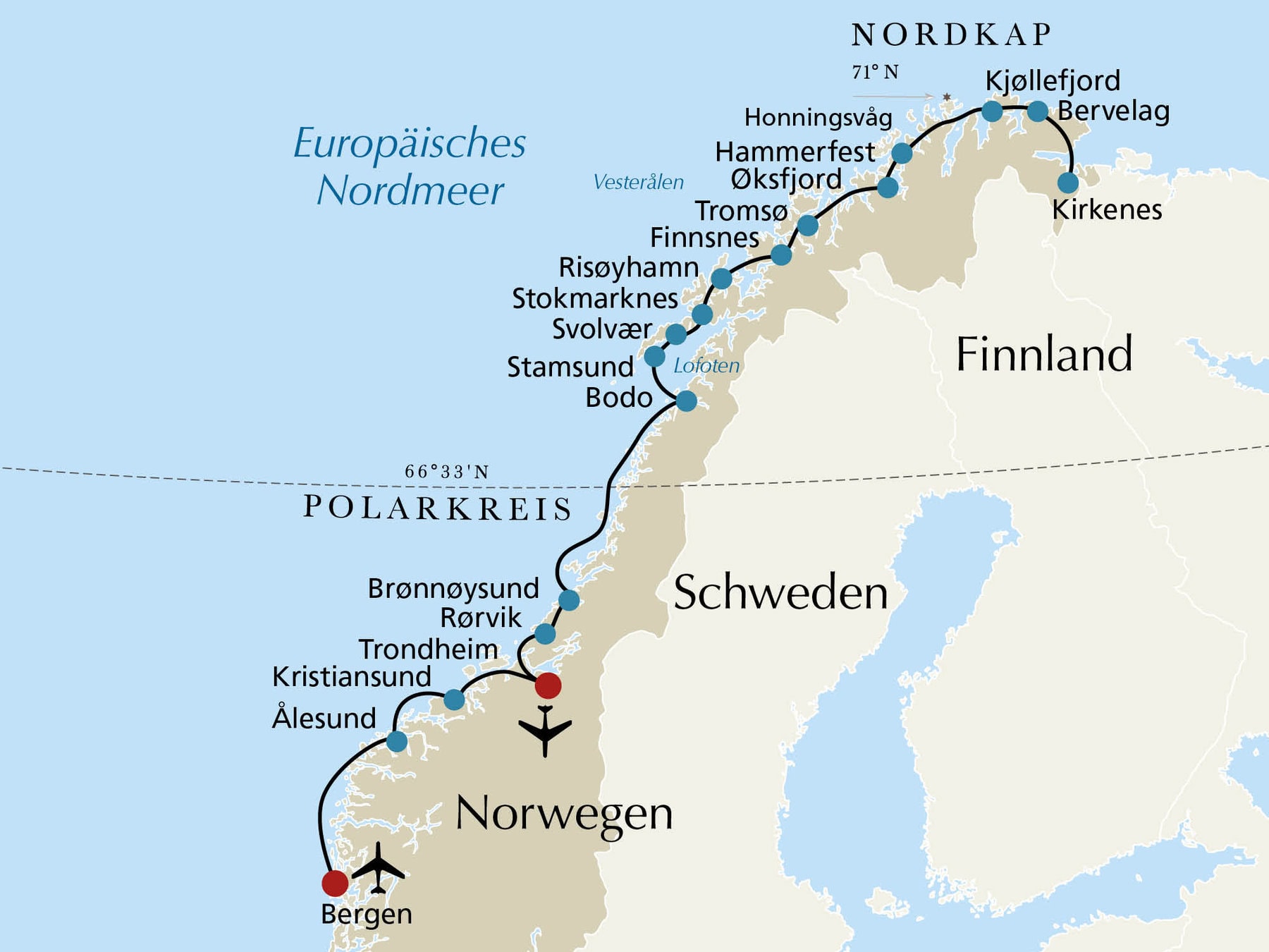 Hinweis: Ein gültiger Personalausweis oder Reisepass muss auch beim Einchecken am Hurtigruten Terminal oder an Bord vorgelegt werden. Vorläufige Ausweispapiere werden hier nicht akzeptiert. Einreisebestimmungen für deutsche Staatsangehörige können sich kurzfristig ändern. Rechtsverbindliche Informationen und/oder über diese Hinweise hinausgehende Informationen zu den Einreisebestimmungen erhalten Sie nur direkt bei der Botschaft oder einem der Generalkonsulate Ihres Ziellandes.