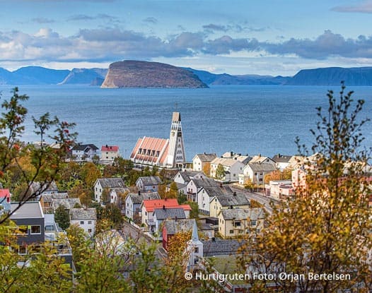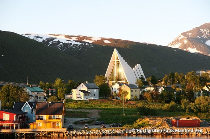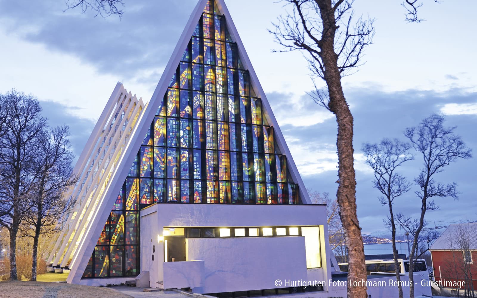 Durch die Risøyrenna, eine schmale Passage zwischen großen Sandbänken, die 1920 eigens für Hurtigruten gebaut wurde, fahren wir bis zur arktischen Hauptstadt Tromsø. Die Stadt wird als ehemaliger Ausgangspunkt für Polarexpeditionen auch „Tor zum Eismeer“ genannt. Berühmtestes Wahrzeichen ist die Eismeerkathedrale mit ihrer eigenwilligen modernen Architektur und den Glasmosaiken. Wenn Sie eine Wanderung auf einen der Berge nahe der Stadt unternehmen, genießen Sie einen atemberaubenden Blick auf Tromsø und die umliegenden Bergketten.